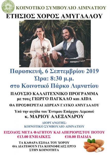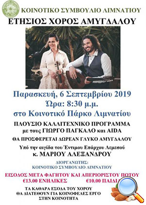 Το πανέμορφο χωριό του Λιμνάτη ξεχωρίζει από όλα τα άλλα χωριά της Κύπρου, γιατί πολύ απλά είναι το χωριό της αμυγδαλιάς, αφού σε καμιά άλλη περιοχή της Κύπρου δεν υπάρχουν τόσες πολλές αμυγδαλιές. Τιμώντας λοιπόν την παράδοση του χωριού, το Κοινοτικό Συμβούλιο Λιμνατίου διοργανώνει και μας προσκαλεί στον ετήσιο Χορό Αμυγδάλου, την Παρασκευή 6 Σεπτεμβρίου στις 20:30, στο κοινοτικό πάρκο.